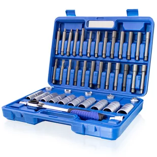 Uniwersalny zestaw do mocowania / demontażu amortyzatorów. Pasuje do większości samochodów. W zestawie praktyczne etui z tworzywa sztucznego. Nasadki sześciokątne długie do luzowania: 14 - 15 - 16 - 17 - 18 - 19 - 21 - 22 - 24 - 27 mm, 1x nasadka do luzowania: