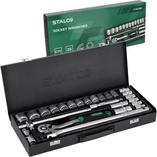 Zestaw kluczy nasadowych z grzechotką 1/2" Stalco S-54009 25 elementów Zestaw kluczy nasadowych 1/2” w metalowym opakowaniu. Stal CrV. NAJWAŻNIEJSZE PARAMETRY Stal CrV 72 zęby Rozmiar 1/2" Metalowe pudełko 18 x Nasadki sześciokątne: 8, 10, 11, 12, 13, 14, 15, 16, 17, 18, 19, 21, 22, 23, 24, 27, 30, 32 mm 1 x grzechotka: 1/2’ 72 T 2 x Nasadki do świec: 16 mm, 21 mm 1 x Przedłużka: