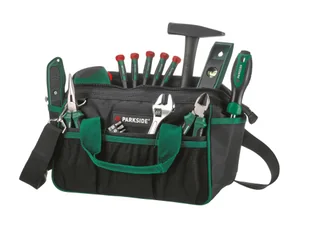 Parkside® Zestaw narzędzi w torbie, 23 elementy Opis produktu zestaw narzędzi w praktycznej torbie do przechowywania zawartość: 1x kombinerki 1x szczypce 1x klucz nastawny 1x nóż do cięcia z ostrzem 1x młotek ciesielski, 300 g 1x poziomica 1x uchwyt do bitów wkrętakowych 5x precyzyjne wkrętaki 10x bitów; 25 mm 1x miara taśmowa, 5 m Cechy produktu table{width:100%;}td{padding-right: 30px; padding: 0.5rem; border-bottom: 0.0625rem solid #e3e4e5;} tr: nth-child(odd) {background-color: #F2F3F4;} Zawartość zestawu 23 elementy Materiał torba: poliester Wymiary ok. 30 x 16 x 18 cm (dł. x szer. x wys.) Maksymalne obciążenie 8 kg