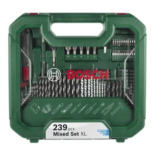 Zestaw mieszany XL marki Bosch, do wiercenia i wkręcania, zapakowany w walizce z tworzywa sztucznego. Zestaw akcesoriów przeznaczona do wiercenia i wkręcania w metalu, drewnie i betonie. Dodatkowo zestaw imbusów i narzędzi ręcznych. 239 sztuk.