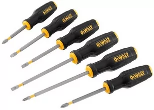 Zestaw 6 wkrętaków DeWALT DWHT0-62056-0, wykonane w technologii MAX FIT. Specjalna konstrukcja końcówki zapewnia maksymalne dopasowanie, eliminując możliwość uszkadzania śrub. Rękojeść pokryta gumą poprawia pewność chwytu dla poprawy komfortu użytkowania i zwiększenia siły dokręcania. Grot w kształcie sześciokąta umożliwia użycie klucza, zwiększając siłę dokręcenia lub odkręcenia zapieczonych śrub. Wkrętaki wyprodukowane w klasie S2, to gwarancja wysokiej wytrzymałości oraz trwałości. Groty wkrętaków pokryte są czarnym chromem, zabezpiecza przed korozją i zapewnia estetyczny wygląd.