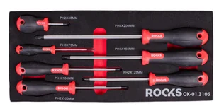 Zestaw wkrętaków PH, 7 cz. Zestaw wkrętaków PH, z ergonomiczną dwukompozytową rękojeścią. Zestaw składa się z 7 elementów wykonanych z wysokiej jakości stali chromowo-wanadowej. Wszystkie elementy umieszczone są w wytłoczonym wkładzie piankowym dopasowanym wymiarami do 1/3 powierzchni szuflady w warsztatowej szafce narzędziowej. Wkład piankowy wykonany jest z wysokiej jakości pianki odpornej na olej i chemikalia i dzięki precyzyjnemu wyprofilowaniu zapewnia stały porzadek w narzędziach.