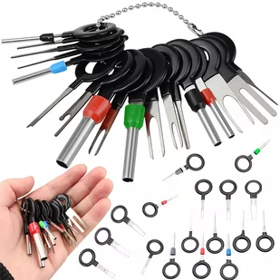 ✅INSTRUKCJA PRACY Uniwersalny zestaw 18 sztuk wyjmaków do demontażu pinów (konektorów). Komplet składa się z 3 rodzajów kluczy (pojedynczych, podwójnych oraz rurkowych) o zróżnicowanej grubości. Doskonale nadają się do napraw kostek elektrycznych i instalacyjnych. Obowiązkowe wyposażenie wszystkich osób zajmujących się naprawami samochodowej elektryki czy sprzętu komputerowego. ✅ZALETY produkt fabrycznie nowy, wysokiej jakości profesjonalny zestaw kluczy do demontażu pinów (konektorów) ułatwia usuwanie uszkodzonych konektorów z gniazd proste użytkowanie (wystarczy pewnym ruchem usunąć PIN chwytając go odpowiednim kluczem) materiał: