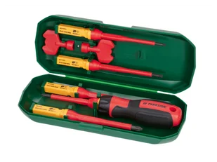 Parkside® Zestaw wkrętaków z wymiennymi końcówkami; 1000 V, 8 elementów Opis produktu Do bezpiecznej pracy z częściami pod napięciem do 1000 V. Cechy produktu table{width:100%;}td{padding-right: 30px; padding: 0.5rem; border-bottom: 0.0625rem solid #e3e4e5;} tr: nth-child(odd) {background-color: #F2F3F4;} Zestaw: 8-częściowy Zawartość: 1x Uchwyt wkrętaka z mocowaniem na wymienne końcówki; 5x Wymienna końcówka; 2x Klucz do szafy rozdzielczej Wymiary: