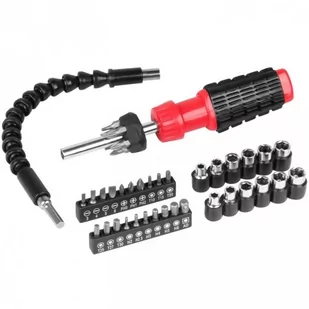 Wkrętak z wygodnym gumowanym uchwytem i elastyczną przedłużką wyposażony w zestaw bitów i nasadek. Zestaw składa się z 40 elementów. Zawartość zestawu: bity (groty) magnetyczne ze stali chromowo - wanadowej (CR-V): PZ1, PZ2, PZ3 ; T10, T15, T20, T25, T27, T30 ; S0, S1, S2 ; 3mm, 4mm, 5mm, 6mm ; PH0, PH1, PH2 nasadki: