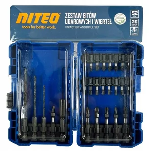 ZESTAW BITÓW UDAROWYCH I WIERTEŁ 26 SZTUK NITEO 26 elementów Wyjątkowo wytrzymała stal S2 W zestawie: bity 25 mm (16szt.), bity 50 mm (6szt.), wiertła z uchw...