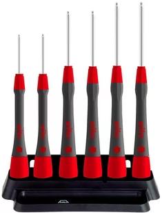 Zestaw wkrętaków/ śrubokrętów precyzyjnych sześciokątnych firmy Wiha model 264PK6 Profesjonalny zestaw wkrętaków / śrubokrętów precyzyjnych sześciokątnych / imbusowych z główką niemieckiego producenta Wiha. Rękojeść PicoFinish wyróżnia się ergonomicznym kształtem rękojeści i zastosowaniem najlepszych materiałów. Komfortowe wkrętaki precyzyjne z wielo-komponentową rękojeścią i strefą szybkiego przykręcania dzięki łatwo obracającemu się kołpakowi. Zestaw zawiera 6 wkrętaków precyzyjnych o wielkości od 0,9 do 3,0 mm. Wkrętaki precyzyjne dla elektroników, modelarzy i majsterkowiczów.