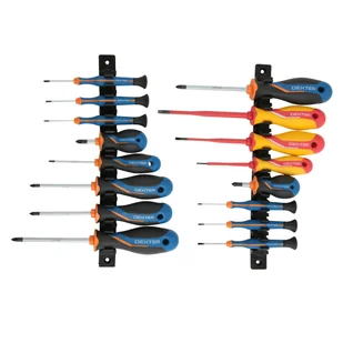 Zestaw wkrętaków Dexter zawiera 16 wkrętaków. Ich miękki plastikowy uchwyt z dwóch materiałów zapewnia dobry chwyt.