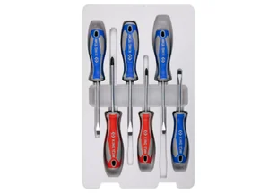Zestaw 6 wkrętaków King Tony. W zestawie śrubokręty krzyżakowe No.1x80 oraz No.2x100 i płaskie 5x75, 5x100, 6.5x100, 6.5x150. Karta produktu - 31216MR