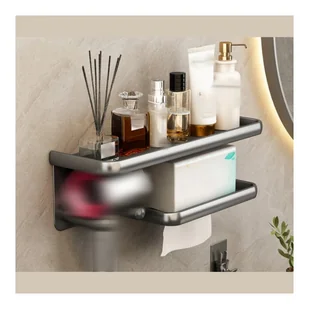 Praktyczne przechowywanie: Praktyczne rozwiązanie do organizacji łazienki z uchwytem na suszarkę do włosów i dedykowanym miejscem na chusteczki do demakijażu.