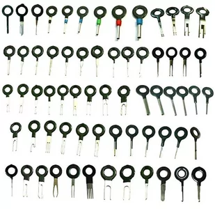 Uniwersalny zestaw 66 sztuk wyjmaków do demontażu pinów (konektorów). Komplet składa się z wielu rodzajów kluczy (pojedynczych, podwójnych, rurkowych oraz potrójnego i poczwórnego) o zróżnicowanej średnicy. Doskonale nadają się do napraw kostek elektrycznych i instalacyjnych. Obowiązkowe wyposażenie wszystkich osób zajmujących się naprawami samochodowej elektryki czy sprzętu komputerowego. Cechy i specyfikacja produktu: