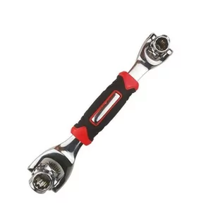 Wielofunkcyjny, uniwersalny klucz obrotowy. Z powodzeniem zastąpi szereg innych narzędzi! Doskonale nadaje się do wszelkiego rodzaju śrub i nakrętek dzięki szerokiemu zakresowi rozstawów (od 8 do 19 mm). Wyposażony w dwie obrotowe głowice o zakresie 360 stopni, a każda z nich posiada 4 otwory. Wygodna, gumowana rączka zwiększa pewność chwytu i zapobiega zmęczeniu dłoni. Niezbędny gadżet każdego majsterkowicza.
