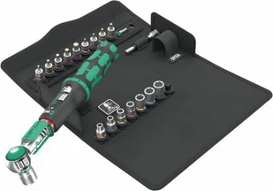 20-częściowy; w przyjaznym dla powierzchni, kompaktowym pudełku tekstylnym o wysokiej wytrzymałości. Niewielka objętość i waga ułatwiają mobilność. 1 Klucz dynamometryczny Safe-Torque A 1 z napędem kwadratowym 1/4", zakres pomiarowy 2-12 Nm; do kontrolowanego dokręcania w prawo i w lewo; dokręcanie i odkręcanie z momentem obrotowym i bez, możliwość wyłączenia funkcji momentu obrotowego (funkcja blokady momentu obrotowego); 72 zęby; niski kąt powrotu 5°; łatwe ustawianie i zabezpieczanie żądanej wartości momentu obrotowego, z słyszalnym i wyczuwalnym kliknięciem po osiągnięciu wartości skali, mechanizm zwalniający po osiągnięciu ustawionej wartości momentu obrotowego; ergonomiczna 2-komponentowa rękojeść; 8 nasadek Zyklop, 9 nasadek Zyklop (gniazdo sześciokątne, TORX®), 1 przedłużka Zyklop z tuleją szybkiego zwalniania, krótka