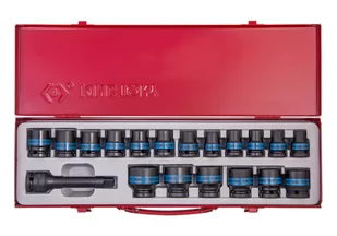 W zestawie:- nasadki: 10, 11, 12, 13, 14, 15, 16, 17, 18, 19, 21, 22, 23, 24, 26, 27, 30, 32 mm, - przedłużka udarowa 1/2", 125 mm z kulką. Karta produktu - 4419MP