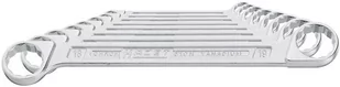 Zestaw kluczy oczkowych podwójnych prostych Wykonanie: DIN 837 B, ISO 3318. Ze stali chromowo-wanadowej, chromowany matowo, oczka cienkościenne i przesunięte w bok, polerowany. Skład zestawu: 6 x 7; 8 x 9; 10 x 11; 12 x 13; 14 x 15; 16 x 17; 18 x 19; 21 x 22 mm Skład zestawu: