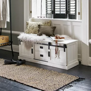 buty trafiają do dwóch bocznych przegródek ławki, a czapki i inne dodatki do jednej z dwóch szuflad! A Twój przedpokój będzie w końcu zawsze pięknie uporządkowany, dzięki czemu Twoja nowa ławka również zaprezentuje się z dużo lepszej strony. Ze swoją świeżą bielą, rustykalnym wyglądem listew i żelaznymi elementami jest to prawdziwy klejnot o nowoczesnym marynistycznym wyglądzie. A ponieważ została starannie wykonana ze szlachetnego, wytrzymałego drewna mango, można na niej bez obaw usiąść również podczas zmiany obuwia. Za przesuwnymi drzwiami po prawej i lewej stronie oraz w dwóch przestronnych szufladach pośrodku znajdziesz mnóstwo miejsca na buty, ale także na czapki z daszkiem, kapelusze kapitańskie itp.