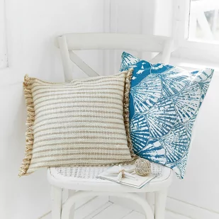 Morski szyk spotyka się z ponadczasowym wzorem w paski – w rzeczywistości każda poszewka na poduszkę sama w sobie przyciąga wzrok, jednak razem tworzą fantastycznie piękny duet. Poszewka z nadrukiem muszli w świeżym kolorze z przodu została dodatkowo ręcznie wyhaftowana, zaś poszewka w paski zyskała piękną strukturę dzięki charakterystycznej tkaninie z przędzy flammgarn – ozdobiono ją uroczymi frędzlami. Praktyczny zamek błyskawiczny uzupełnia te wykonane z czystej bawełny tekstylia. Harmonijne połączenie, które idealnie akcentuje morski klimat wnętrza – orzeźwiające i cudownie przytulne. Wszak poduszek podczas relaksu na sofie lub w ulubionym fotelu nigdy dość!