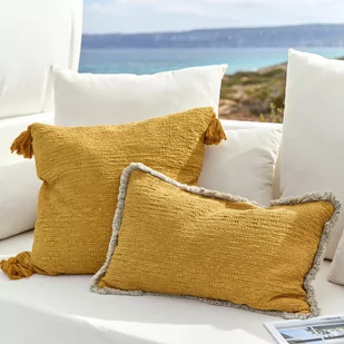 Ze strukturalnej, miękkiej w dotyku bawełny. Radosny odcień uzupełniają duże i małe frędzelki. Dwa rozmiary w zestawie. Te dwie piękne poszewki na poduszki mają wyjątkowo słoneczny charakter i od razu wprawiają w dobry nastrój. Szykowne frędzle nadają im klimat boho – z pewnością wzbogacą swoim urokiem każde pomieszczenie.