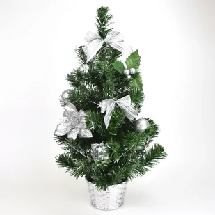 Sztuczna choinka ozdobiona srebrnym ponsetem, kokardkami, kulkami i prezentami to świetny wybór na świąteczną dekorację. Wykonana z zielonego i srebrnego sztucznego ostrokrzewu choinka wniesie do domu tradycyjną świąteczną atmosferę. Dzięki wysokości 50 cm i szerokości 25 cm, drzewko to pasuje do każdej przestrzeni, czy to na stole, czy na parapecie. Srebrna donica nadaje choince elegancki i nowoczesny wygląd. Z mnóstwem srebrnych ozdób i łańcuchem z gwiazdami, ta choinka będzie efektowna i pełna blasku.