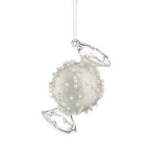 Ozdoba choinkowa - duży CUKIEREK z koralikami Nietypowa ozdoba świąteczna w kształcie cukierka. Wykonana jest w całości z bezbarwnego, przeźroczystego szkła i zdobiona ręcznie brokatem w biało-srebrnym kolorze. Luksusowego charakteru dodają bombce perełki. Szklane cukierki choinkowe to ozdoby z nutą nostalgii, które także z pewnością wzbudzą zachwyt dzieci. Bombka jest dość dużych rozmiarów: