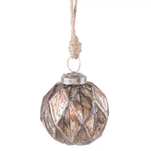 Bombka choinkowa miedziana postarzana. Dekoracja o załamanej fakturze w pięknych odcieniach miedzi, mocno postarzana i poprzecierana powierzchnia nadaje tej ozdobie świątecznej wyjątkowy charakter, który pięknie dopełni dekorowane drzewko świąteczne. Bańka zawieszona na jutowym sznurku. Wymiary: średnica 7 cm, wysokość 8 cm