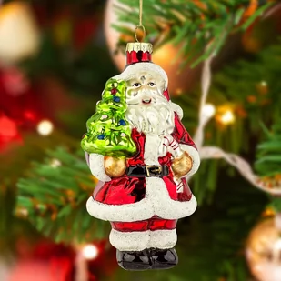 Bombka retro - Mikołaj z choinką Bombka Mikołaj to sposób na ozdobienie choinki w stylu retro. Design ten nawiązuje do ubioru choinek świątecznych w okresie PRL. Bombka posiada metalowy zaczep. Ze względu na ręczne wykonanie bombki mogą się nieznacznie różnić. Wymiary: wysokość: ok. 13,5 cm