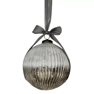 BOMBKA SZKLANA DUŻA DEKORACJA ŚWIĄTECZNA Śliczna szklana bombka w kolorze biało-srebrnym o nierównej fakturze Idealna ozdoba na choinkę bądź jako element dekoracyjny do każdej świątecznej aranżacji. Można je zawiesić na karniszu przy oknie, na lapie czy położyć na tacy z innymi dekoracjami na komodzie czy stole Wigilijnym Piękna dekoracja Świąt Bożego Narodzenia, wykonana z dużą starannością, masywna o nierównej lekko połyskującej powierzchni. Informacje dodatkowe: Wymiary: 15 x 15 x 15 cm Materiał: szkło Kolor: