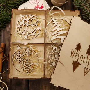 Bombki B - zestaw ozdób choinkowych, 24 sztuk Małe detale sprawiają, że Święta Bożego Narodzenia stają się jeszcze bardziej magiczne. Naturalne, drewniane ozdoby choinkowe z całą pewnością uczynią te Święta bardziej ciepłymi i nastrojowymi, a ubieranie choinki będzie niebywałą przyjemnością. Zestaw drewnianych ozdób choinkowych Drewniane ozdoby choinkowe wycinane są laserowo z 3 mm sklejki brzozowej i mają wymiar 8 cm w najszerszym miejscu. Do każdej zawieszki otrzymasz jutowy sznurek do zwieszenia ozdoby na choince! Wybierz w jakim kolorze mają być Twoje ozdoby! Do wyboru jest 6 wariantów - biały, złoty, srebrny, metaliczny czerwony, metaliczny niebieski oraz naturalnie - kolor naturalnego drewna! Zestawy skomponowane są tak, aby wyglądały najlepiej w dołączonym pudełku prezentowym. Drewniane pudełko z motywem świątecznym wykonane jest z 3 mm sklejki brzozowej, a jego wymiary zewnętrzne to 17,9 cm x 17,9 cm x 3 cm.