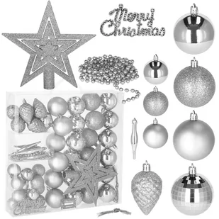 Stwórz wymarzone bożonarodzeniowe przybranie! Bombki choinkowe w zestawie 51 szt. w kolorze srebrnym nadadzą Twojemu drzewku niepowtarzalnego uroku. Cudownie zdobione poszczególne bańki obsypane lśniącym brokatem, pięknie połyskują w ciągu dnia, jak i po zmroku odbijając światło lampek choinkowych. Wykonany z materiału sztucznego zwiększa bezpieczeństwo poprzez nie tłukące się tworzywo. Gratisowe sznureczki pozwalają na łatwe zamocowanie ich w wybranym przez siebie miejscu.