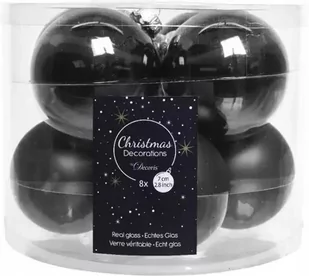 Parametry: Szerokość: 7 cm Materiał wykonania: szkło Motyw: bombki świąteczne Kolor dominujący: czarny Ilość sztuk: 8 Kształt: okrągły Zastosowanie: