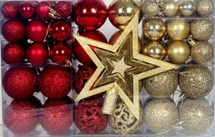 Zestaw bombek choinkowych w kolorze czerwonego złota: matowa bombka, błyszcząca bombka, błyszcząca pusta bombka, bombka w paski, złota bombka kratowa, matowa bombka w kształcie płatka śniegu, zawieszka choinkowa, złoty / czerwony długi lampion w paski, hortensja w kształcie kwiatu, złoty naszyjnik z pereł o długości 10 m, ozdoby choinkowe sople itp. 101 kombinacji elementów łapie światła choinki i rozkwita. Spraw, aby świąteczna atmosfera była wyjątkowa i piękna!Różne rozmiary: 3 cm, 4 cm, 6 cm.