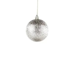 Zestaw plastikowych, dekorowanych bombek choinkowych w kolorze srebrnym. Średnica: 6 cm. Opakowanie: 6 szt.