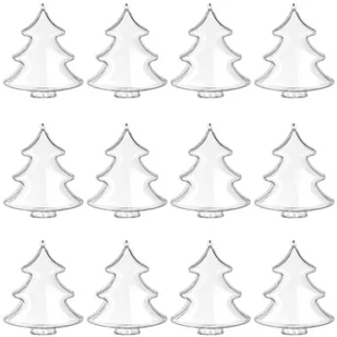 Zestaw choinek akrylowych. Komplet zawiera 12 sztuk. Wymiary: 10x12x4,5cm. Idealnie sprawdzi się jako samodzielna dekoracja lub możesz stworzyć z niej własnoręcznie udekorowaną bombkę na choinkę. Dzięki temu, że całość składa się z dwóch połówek do samodzielnego złożenia, bez większego trudu jesteś w stanie ozdobić ją od wewnątrz-użyj do tego sztucznego śniegu, brokatowych ozdób, puchu lub organzy.