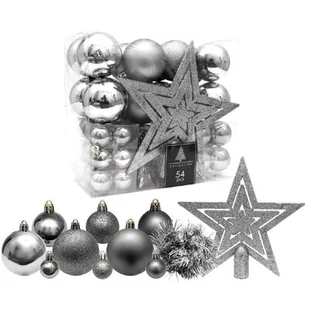 : 6 cm Waga netto: 0,339 kg Ilość elementów w zestawie: 54 szt, 52 bombki, 1 łańcuch, 1 czubek Materiał: tworzywo sztuczne Kolor: srebrny Marka: