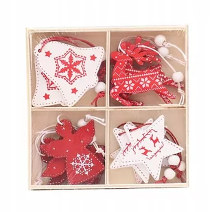 6cm x 5cm, 5,5cm x 5cm Kolor: czerwony, biały Materiał: drewno Ilość sztuk w opakowaniu: 12 Charakterystyka produktu: Posłużą do dekoracji choinki, prezentów, kominka, okna czy też świątecznego stołu Wykonane z drewna Zawieszki zawierają już przewleczony, gotowy to powieszenia, ozdobny sznurek Żywe kolory Staranne wykonanie Zapakowana w drewniane pudełko Idealne na prezent Doskonała dekoracja na Boże Narodzenie