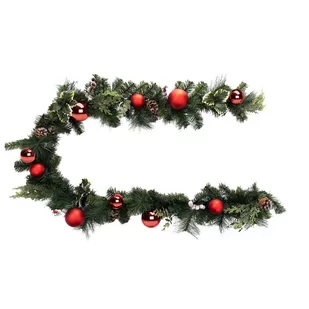 Bombki na girlandzie mają różne wykończenia, dzięki czemu girlanda wygląda niebanalnie, choć jej design jest bardzo spójny. Tworzywo sztuczne: Girlanda wykonana jest z trwałego tworzywa sztucznego, które jest odporne na uszkodzenia i zapewnia długotrwałe użytkowanie. Bogate ozdoby: Girlanda zawiera 8 zestawów liści, 8 zestawów liści ostrokrzewu, 8 sztuk szyszek z brokatem, 2 błyszczące czerwone plastikowe bombki o średnicy 80 mm, 2 matowe czerwone plastikowe bombki o średnicy 80 mm, 3 błyszczące czerwone plastikowe bombki o średnicy 60 mm, 3 matowe czerwone plastikowe bombki o średnicy 60 mm oraz 4 zestawy czerwonych jagód z mrozem.