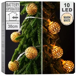 Lampki świecą ciepłym, białym światłem. Bombki umieszczone są na przewodzie w odległości co 10 cm. NA BATERIE - Lampki zasilane są na baterie 2 x AA 1,5V (brak w zestawie). Długość przewodu do pierwszej lampki wynosi 30 cm. Lampki świąteczne w formie małych, ażurowych bombek z oświetleniem led.