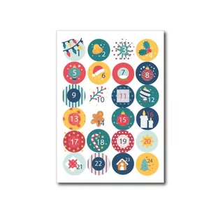 NAKLEJKI ADWENTOWE Stwórz niezapomniane odliczanie do świąt! Dzięki codziennemu otwieraniu torebek magia Świąt pojawi się w Waszym domu już od początku grudnia. Wykorzystaj naklejki adwentowe do stworzenia swojego własnego kalendarza. Produkt zawiera: 24 naklejki adwentowe z numerkami o średnicy 4cm