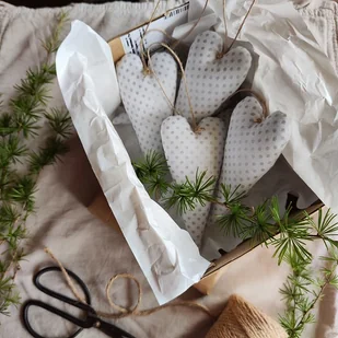 Bombki/zawieszki choinkowe bardzo minimalistyczne. Komplet zawiera 6 sztuk. Tkanina bawełniana biała w srebrne kropeczki. Serduszko o wymiarach: 11,5cmx6cm + sznureczek. Szyte w duchu zerowaste, c ...
