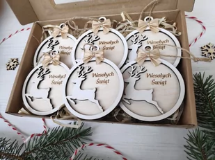 Przepiękny zestaw bombek wykonanych ze sklejki z motywem renifera a nad nim teks "Wesołych Świąt" Bombki mają zawieszki ze sznurka jutowego pod nią jest złota kokardka. Wyglądają bajecznie : ) Cały zestaw zawiera 6szt bombek o średnicy 6cm każda i są umieszczone w pudełku z okienkiem włożonym watą drzewną. Każdy zestaw jest wyposażony w ozdobny sznureczek do przewiązania pudełeczka