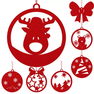 Komplet bombek wykonanych z filcu w kolorze czerwieni. Ilość: 7szt. Mix wzorów: gwiazdki z kokardką, renifer, miś, choinka ze śnieżynkami, choinki z gwiazdkami, śnieżynki z choinkami oraz kokardka. Wszystkie bombki oprócz wstążeczki są w okręgu i mają wymiar: 8x8cm. Wymiar kokardki: