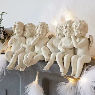Sześć czarujących aniołków połączonych w jedną całość – cudowna grupka siedząca na krawędzi półki. Figurki są misternie ręcznie malowane i mają śliczne, mieniące się detale. Te słodkie aniołki wykonano z żywicy polimerowej. Uroczy akcent na czas Świąt Bożego Narodzenia. Małe figurki zdają się uśmiechać radośnie i szeptać do siebie – być może szepczą sobie nawzajem świąteczne życzenia ludzi? Na kominku, półce czy parapecie – minianiołki wprowadzą do Twoich pomieszczeń piękny, tradycyjny i świąteczny nastrój.