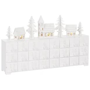 Oświetlona wioska bożonarodzeniowa wprowadza magiczną świąteczną atmosferę do każdego salonu. Szufladki kalendarza adwentowego wykonane z płyty MDF są przystosowane do samodzielnego napełniania, dzięki czemu w każdym pudełku można schować zarówno smakołyki, jak i inne drobne przedmioty. Szczegóły: Typ: Figurka dekoracyjna Styl: Nowoczesny Kolor: Biały Barwaświatła: