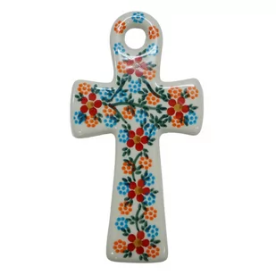 Krzyż wiszący (A235 D54) Oryginalne ceramiczne krzyżyki wiszące, ręcznie malowane w rodzinnej fabryce ceramiki artystycznej w Bolesławcu, ANDY Ceramika. Krzyż na ścianę z możliwością zawieszenia, dzięki otworowi w górnej części krzyża. Stanowi idealny dodatek również do świątecznych stroików na stół czy jako element dekoracji ściennej domu. Krzyże ceramiczne to ozdoby i symbole religijne, ręcznie malowanie w tradycyjne i unikatowe wzory ceramiki artystycznej. Krzyż ceramiczny doda elegancji twojego wystroju domu i sprawi, że tradycyjny krzyż drewniany bądź metalowy zostanie zastąpiony krzyżykiem ceramicznym.