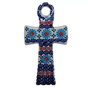 Krzyż wiszący (A235 D3) Oryginalne ceramiczne krzyżyki wiszące, ręcznie malowane w rodzinnej fabryce ceramiki artystycznej w Bolesławcu, ANDY Ceramika. Krzyż na ścianę z możliwością zawieszenia, dzięki otworowi w górnej części krzyża. Stanowi idealny dodatek również do świątecznych stroików na stół czy jako element dekoracji ściennej domu. Krzyże ceramiczne to ozdoby i symbole religijne, ręcznie malowanie w tradycyjne i unikatowe wzory ceramiki artystycznej. Krzyż ceramiczny doda elegancji twojego wystroju domu i sprawi, że tradycyjny krzyż drewniany bądź metalowy zostanie zastąpiony krzyżykiem ceramicznym.