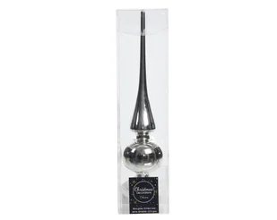 Szpic na choinkę Szpic szklany na choinkę w kolorze srebrnym. Unikalny design przyciąga uwagę i cieszy oko, czarująco podkreśli klimat nadchodzących świąt. Połyskowa powierzchnia zjawiskowo odbija światło nadając wnętrzu wdzięku. Ilość sztuk w opakowaniu: 1 szpic Kolor: