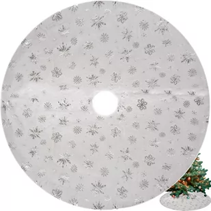 biało srebrny; materiał: 100% poliester; średnica: 120 cm; waga: 379 g; waga w opakowaniu: 424 g. ZALETY świąteczno zimowy design miękkie futerko na prezenty duży nadrukowane srebrne śnieżynki i gwiazdki zapinane na rzepy średnica 120 cm ochrania podłogę łatwe sprzątanie łatwe przechowywanie możliwość ręcznego prania marka RUHHY