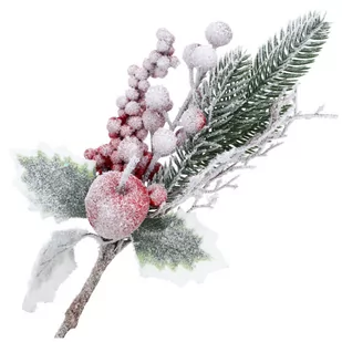 Gałązka typowo świąteczna. Sztuczna dekoracja do wszelkich kompozycji wykonywanych np: przez florystów. Na jednej gałązce znajduje się np: świerk, głóg, jabłko, 3 listki.
