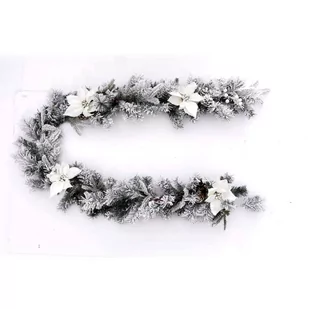 są to flokowane białe kwiaty, szyszki oraz jagodami ostrokrzewu. Wygląd zimowego iglaka: Świąteczna girlanda powstała z gałązek z tworzywa imitujących wygląd iglastego krzewu. Jej powierzchnia pokryta została sztucznym śniegiem, nadającym całości wrażenia lekkości. Lekka konstrukcja: