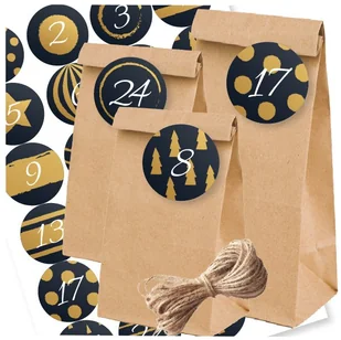 14 sztuk torebek 8x6,5x19 cm 10 sztuk torebek 10x7x28 cm - 24 okrągłe, kolorowe naklejki świąteczne z numerkami - każda z unikalnym wzorem - 10 metrów sznurka jutowego Torebki papierowe wykonane są z grubego, ekologicznego, brązowego papieru kraftowego.